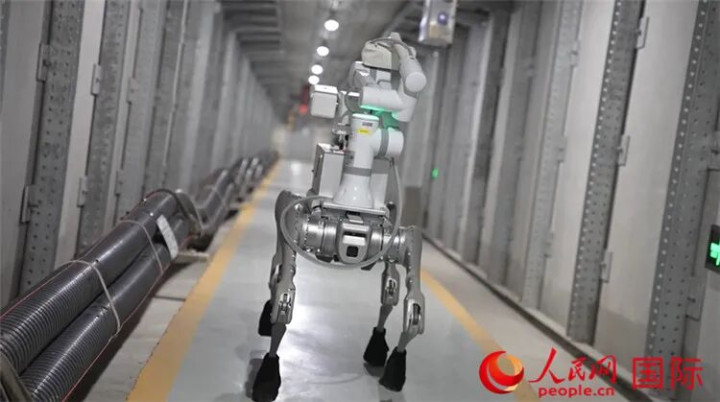 智能巡检四足机器人在雄东—昝西的电力隧道内作业。人民网记者 苏缨翔摄