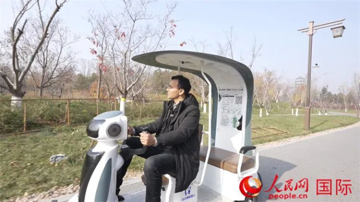 游客驾驶智能导游代步机器人游览悦容公园。人民网记者 袁蒙摄