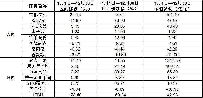 H股市场分化同样明显。行业龙头农夫山泉、康师傅控股股价稳健上涨,其中农夫山泉涨幅较大,每股上涨43.55%,全年市值增长1546.39亿元。中国食品、5100藏冰川年内涨幅也相对较高银河策略,分别为89.27%、65.71%。