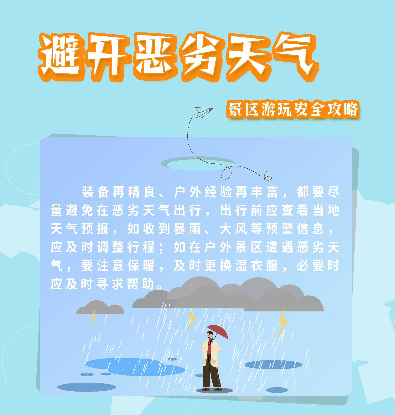 1.提前了解目的地的天气状况,若天气不稳定,则避免出行。