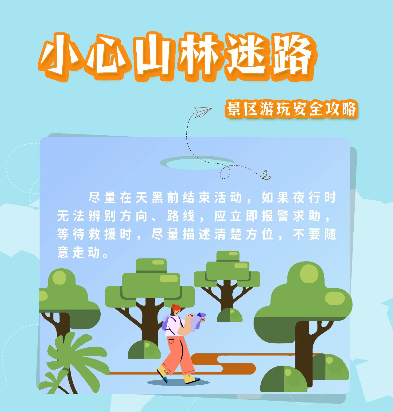 6.迷失方向时不要惊慌,及时报警或拨打求救电话等待救援。